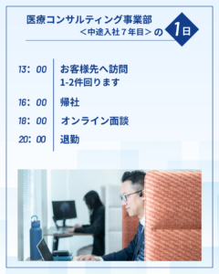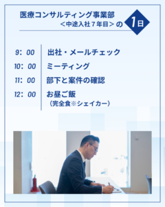 今回は、医療コンサルティング事業部社員〈中途入社7年目〉の1日の流れをご紹介いたします!